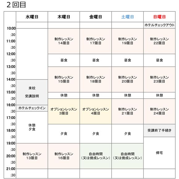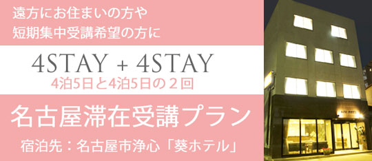 遠方にお住まいの方や、短期集中受講希望の方におすすめのプランです。 レチアンガラス名古屋本部から徒歩5分のビジネスホテル「葵ホテル」にご宿泊いただき、 合計10日間で全28回のレッスンを受講いただけます。(ベーシックコース又はアドバンスコースの場合) ■受講スケジュール![]() ![]() ※上記受講スケジュールはベーシックコース(28コマ)、又はアドバンスコース(28コマ)の場合のスケジュール例です。 ※受講スケジュールは上記水曜日来校以外に、ご希望に応じまして木曜日又は金曜日来校のパターンが可能です。 ※その他来校日や帰宅日、帰宅時間など希望のある方は気軽にご相談下さい。 ■プラン料金 受講料と宿泊費がセットになっています。 ホテルの予約、宿泊料支払いは当方で行います。 価格は税込です